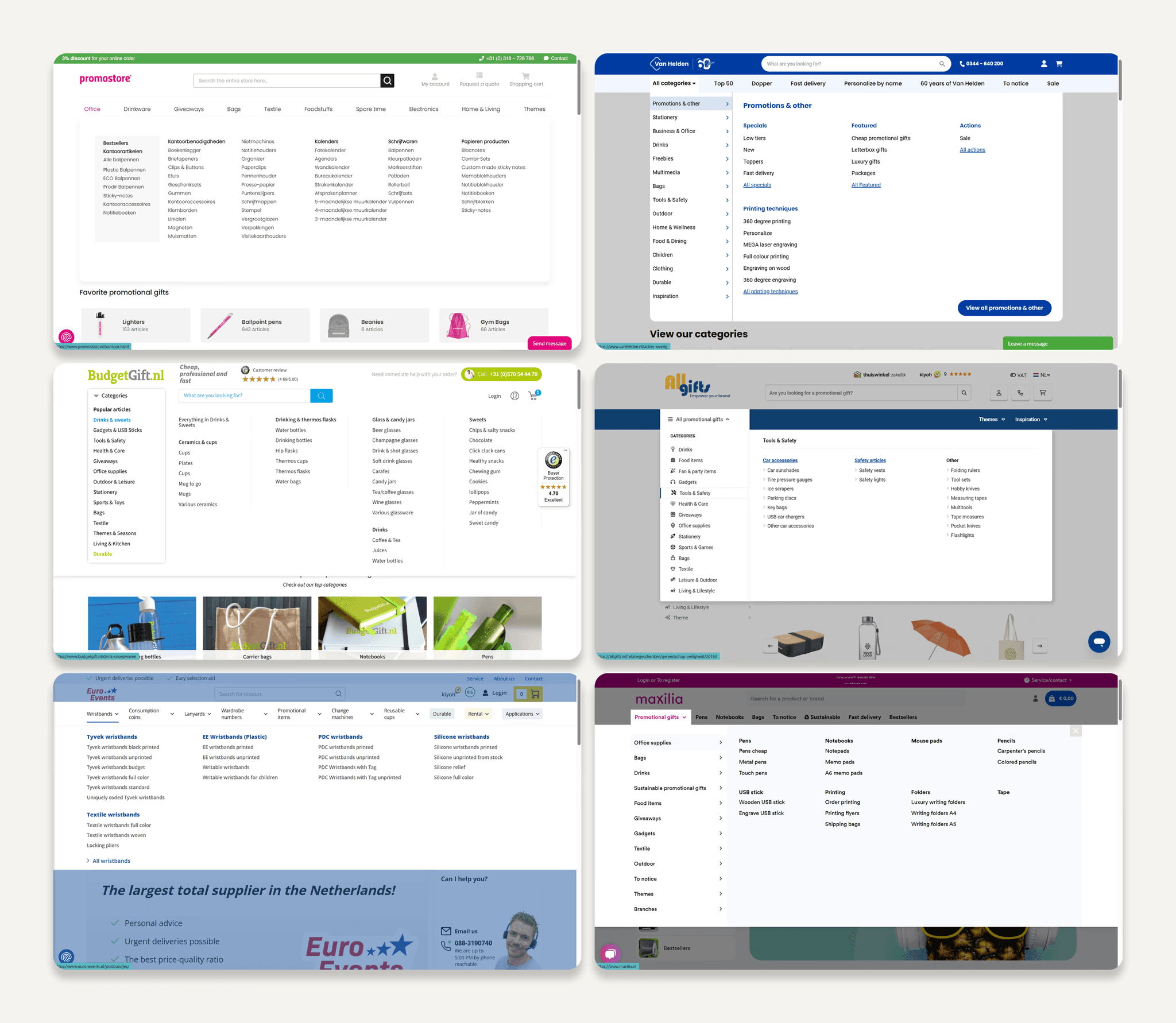 I analysed 6 competitor e-commerce sites in the Netherlands to understand how they handled search, information architecture, and product customisation. The goal was to understand the baseline Dutch users already expected, then find where we could do better.