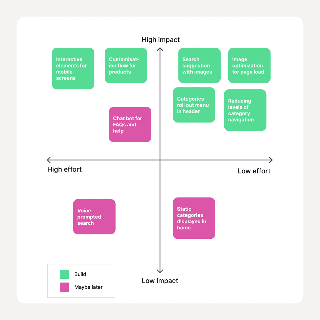With budget and time constraints, we couldn't build everything. I ran a collaborative prioritisation session with engineers, the PM, and backend developers to map features against effort and impact.